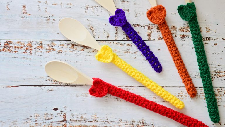Add color and personality to your kitchen with this fun crocheted spoon holder and jar cozy pattern. Designed to fit a wide-mouth mason jar, the striped sleeve brightens up a simple container while holding wooden spoons in style. Each spoon gets its own crocheted casing topped with a cute heart accent, creating a playful and decorative kitchen accessory. Made with easy stitches and worsted weight yarn, this beginner-friendly project is perfect for adding a handmade touch to your countertop or gifting to a fellow cooking enthusiast.