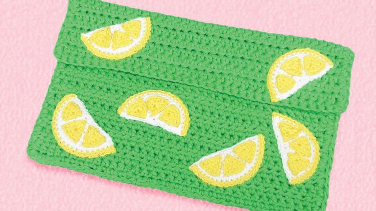 Crochet this bright and fun little pouch with a summery feel. The back flaps over the front and is closed with hook and loop dots. This is a soft pouch that can be used for many purposes, including a makeup/wash bag, pencil case, craft supplies bag, and more!