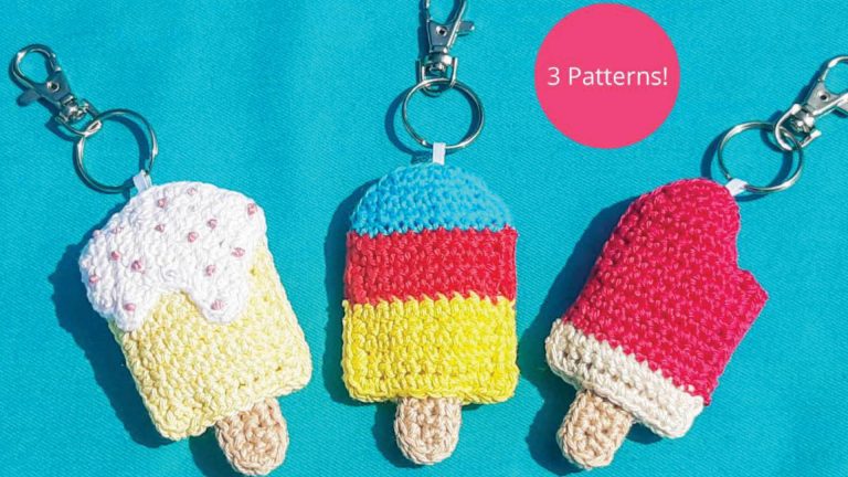 Crochet these playful accessories for adults and children alike. There are three different styles to choose from. Each Popsicle is crocheted as flat pieces, lightly stuffed and then sewn together. Add your keyring hardware and bring the summer fun with you wherever you go!