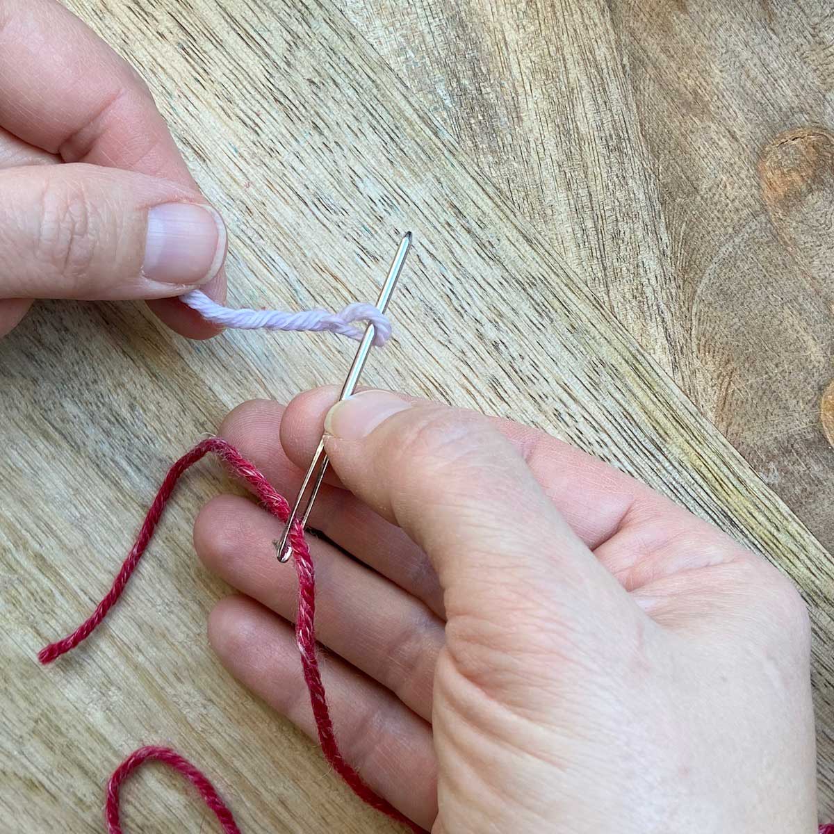 Remove your needle from the first piece of yarn and thread the needle onto the second piece of yarn. Pass the needle through the small loop at end of the first piece.