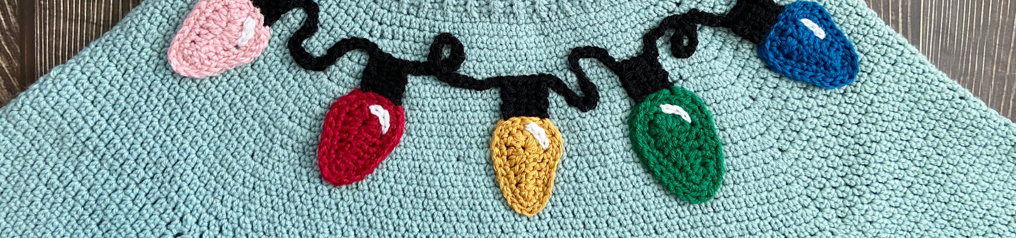 Spread some Christmas Cheer this season when you wear a sweater bedecked with crocheted holiday lights! Whether you use this applique piece to decorate a hand-made sweater or a thrifted one, you will certainly shine bright in the crowd!